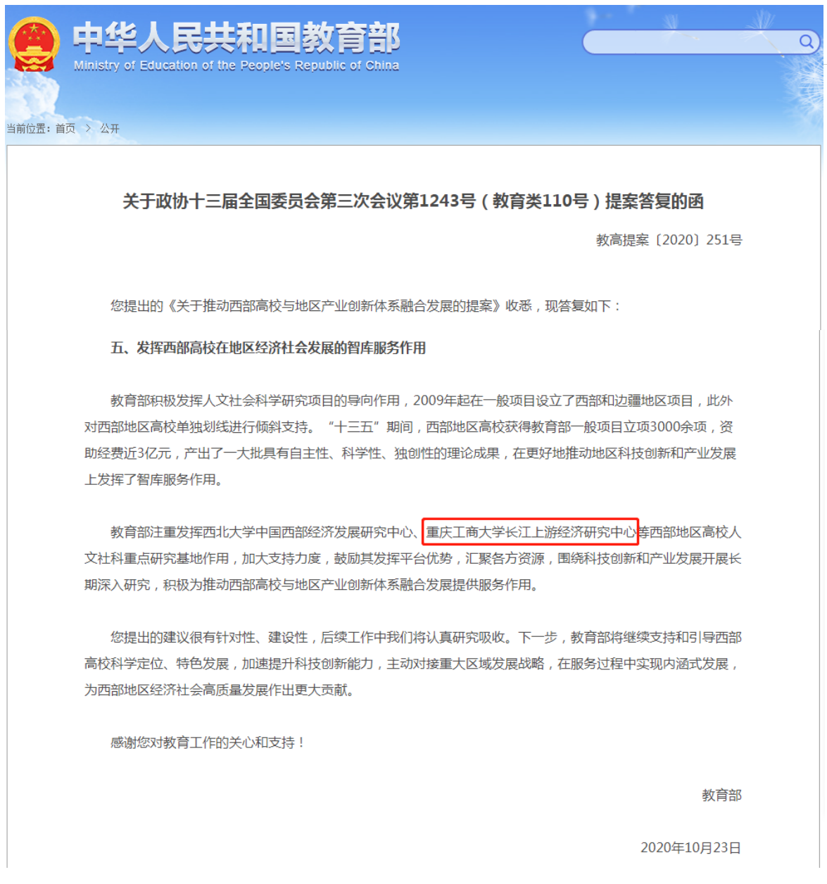 去年底,教育部《关于政协十三届全国委员会第三次会议第1243号(教育类110号)提案答复的函》(教高提案〔2020〕251号)中专门指出:“教育部注重发挥……8xbet体育登录长江上游经济研究中心等西部地区高校人文社科重点研究基地作用,加大支持力度,鼓励其发挥平台优势,汇聚各方资源,围绕科技创新和产业发展开展长期深入研究,积极为推动西部高校与地区产业创新体系融合发展提供服务作用”。