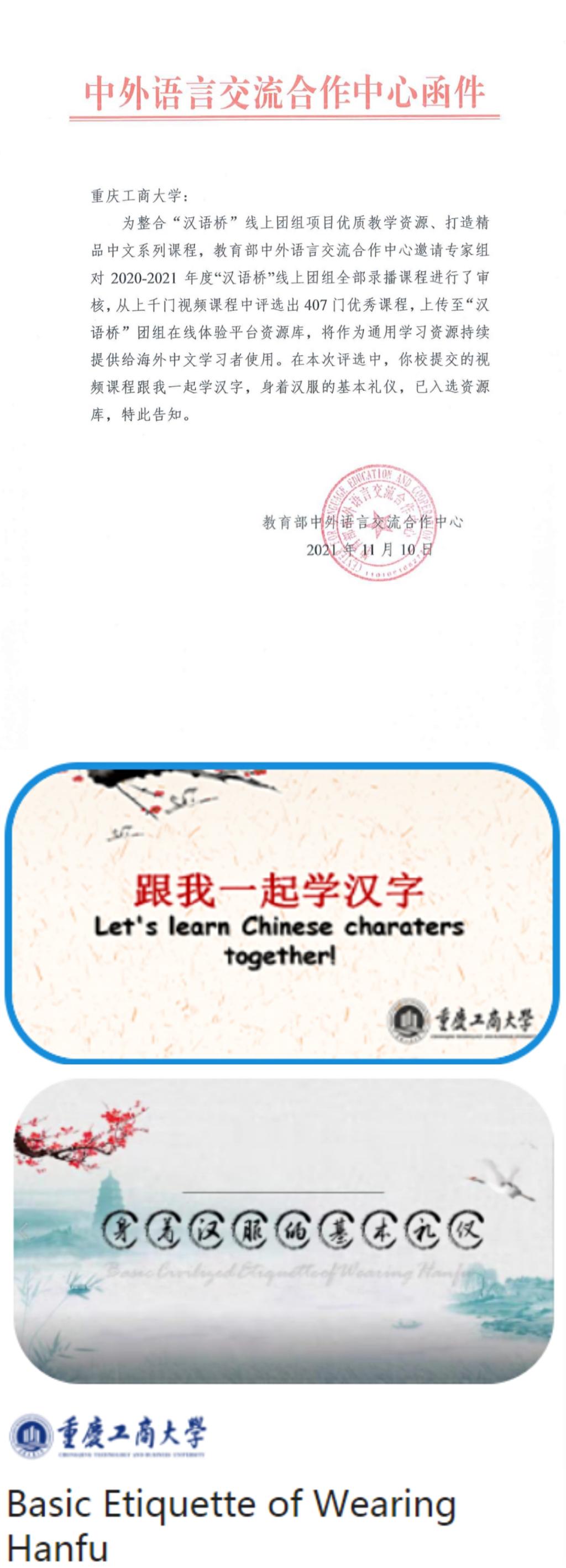 近日,我校接教育部中外语言交流合作中心函告,留学生院制作的《跟我一起学汉字》和《身着汉服的基本礼仪》两门课程被教育部中外语言交流合作中心专家组评为优秀课程,入选语合中心精品教学资源库。