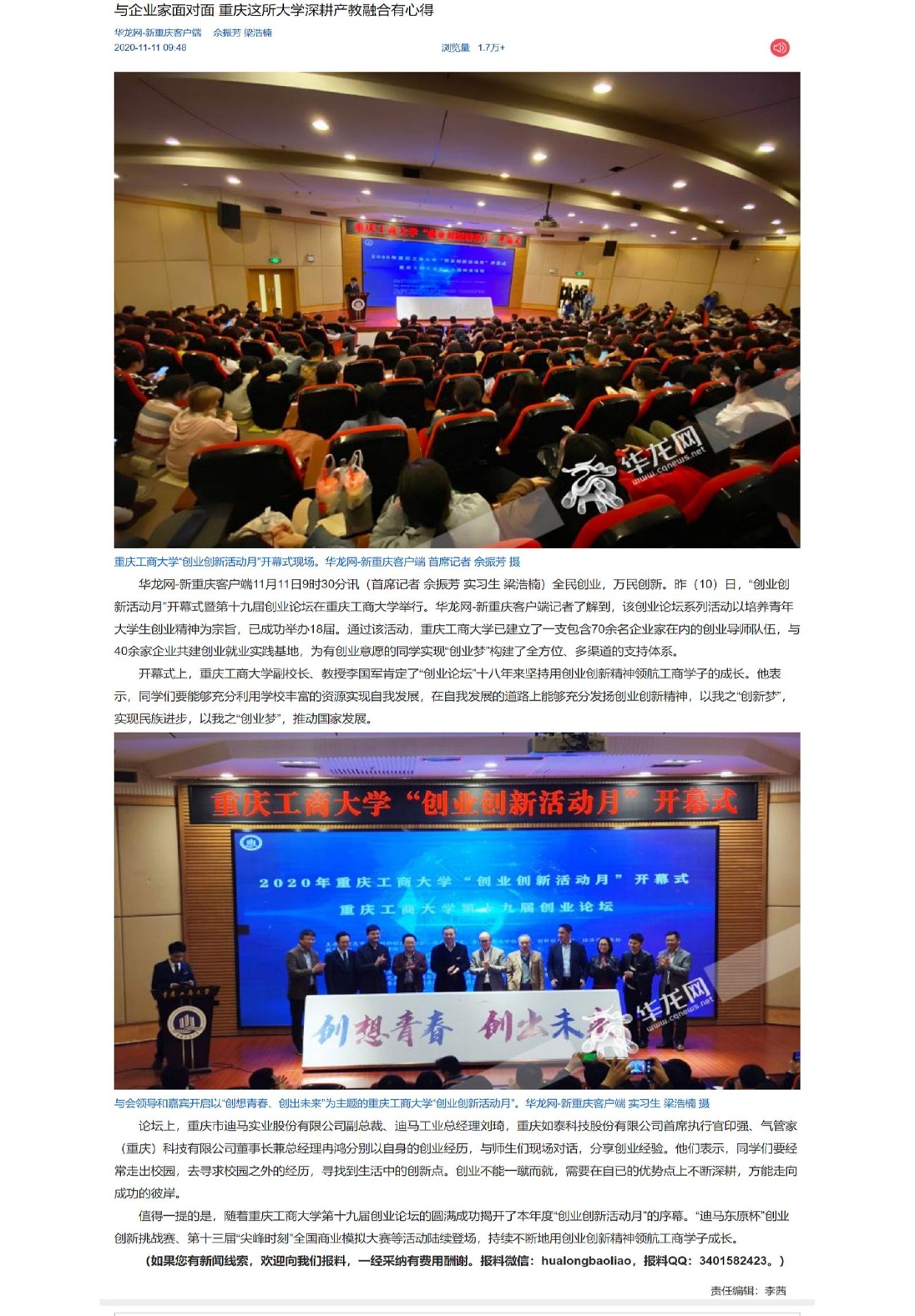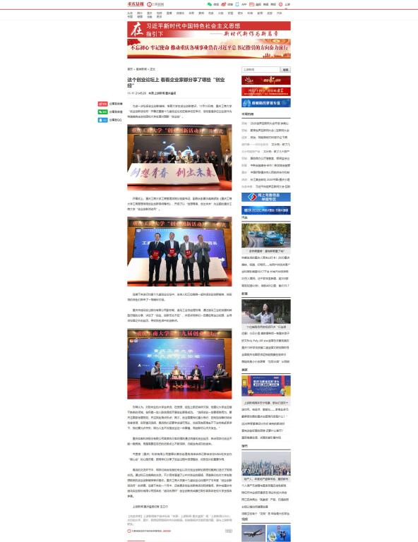 近日,8xbet体育登录“创业创新活动月”开幕式暨第十九届创业论坛在南岸校区博智楼7200学术报告厅成功举行。重庆市迪马实业股份有限公司副总裁、迪马工业总经理刘琦,重庆如泰科技股份有限公司首席执行官印强、气管家(重庆)科技有限公司董事长兼总经理冉鸿分别以自身的创业经历,与师生们现场对话,分享创业经验。此次活动受到上游新闻、华龙网、重庆电视台等多家媒体的关注报道。