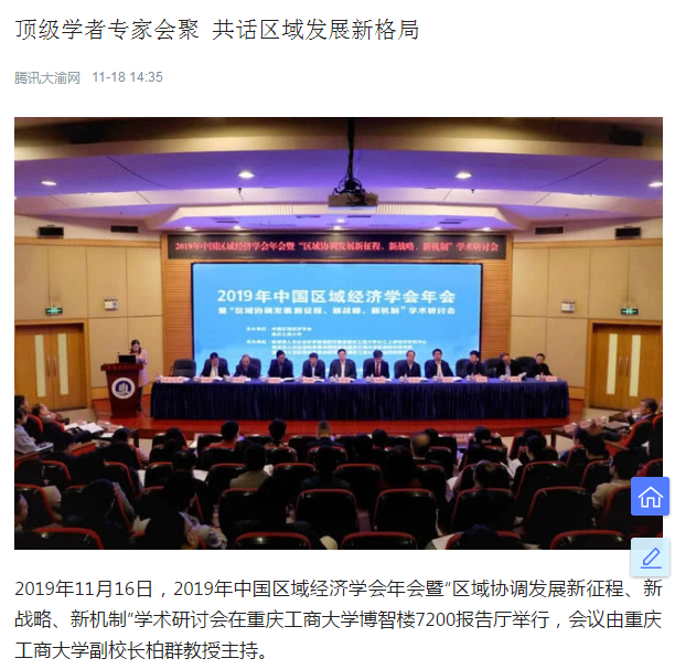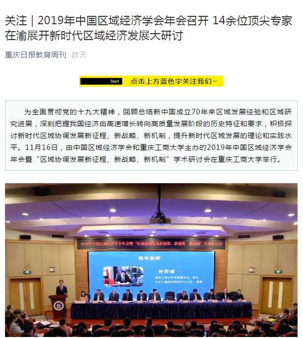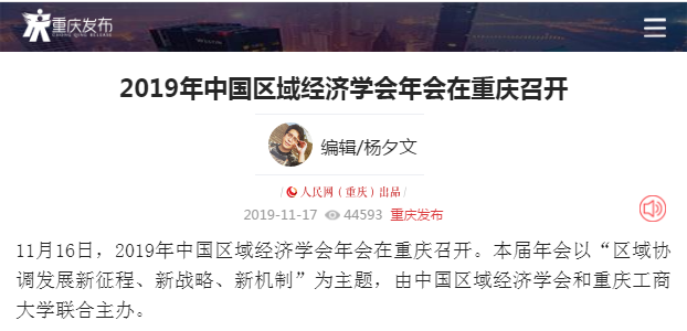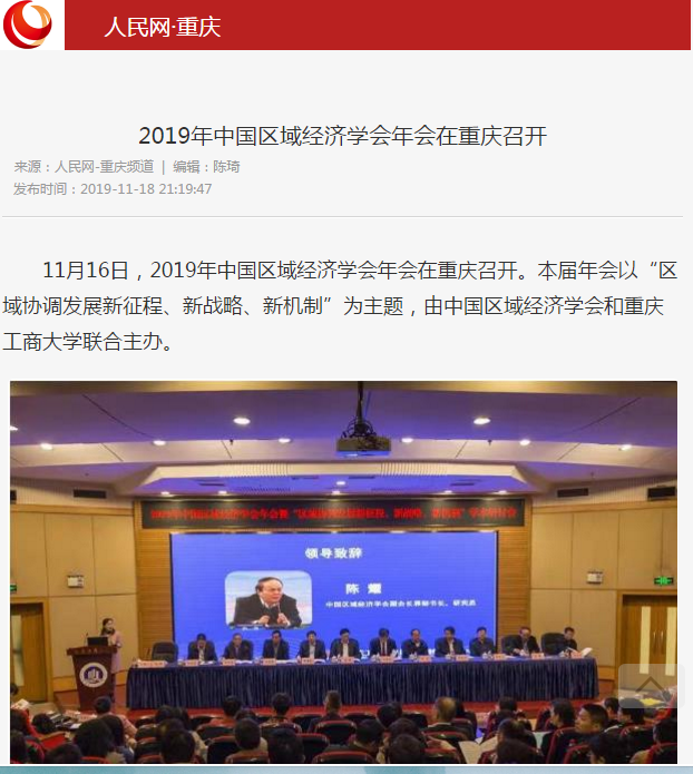 2019年11月15日-16日,2019年中国区域经济学会年会暨“区域协调发展新征程、新战略、新机制”学术研讨会在我校召开,来自中国社会科学院、武汉大学、四川大学、中央民族大学、湖南大学、西南财经大学、中央财经大学、湖北省社会科学院、河南省社会科学院等各地科研院所、高校、党校行政学院、政府机构和企业的专家学者、政府官员及媒体记者共300多人参加了本次研讨会,并邀请了《中国工业经济》《中国高校社会科学》《改革》《经济学家》《当代经济研究》《财经科学》《经济纵横》《经济与管理研究》《宏观质量研究》《软科学》《经济与管理评论》《区域经济评论》《西部论坛》多家学术期刊参会交流。本次年会由中国区域经济学会、8xbet体育登录主办,由教育部人文社会科学重点研究基地8xbet体育登录长江上游经济研究中心、重庆市人文社会科学重点研究基地8xbet体育登录区域经济研究院、重庆市人文社会科学重点研究基地8xbet体育登录产业经济研究院承办,由中国社会科学院西部发展研究中心、重庆市区域经济学会、区域经济评论杂志社、改革杂志社、《西部论坛》编辑部协办。