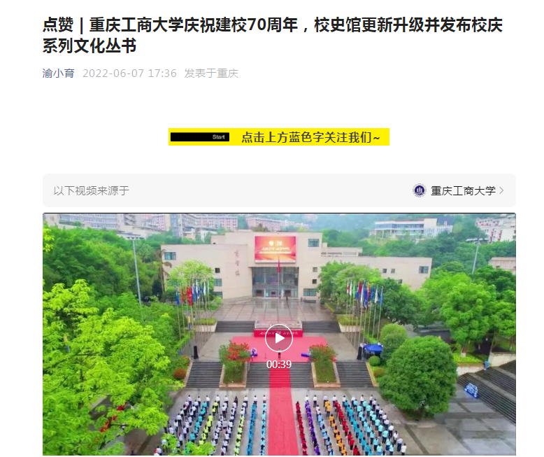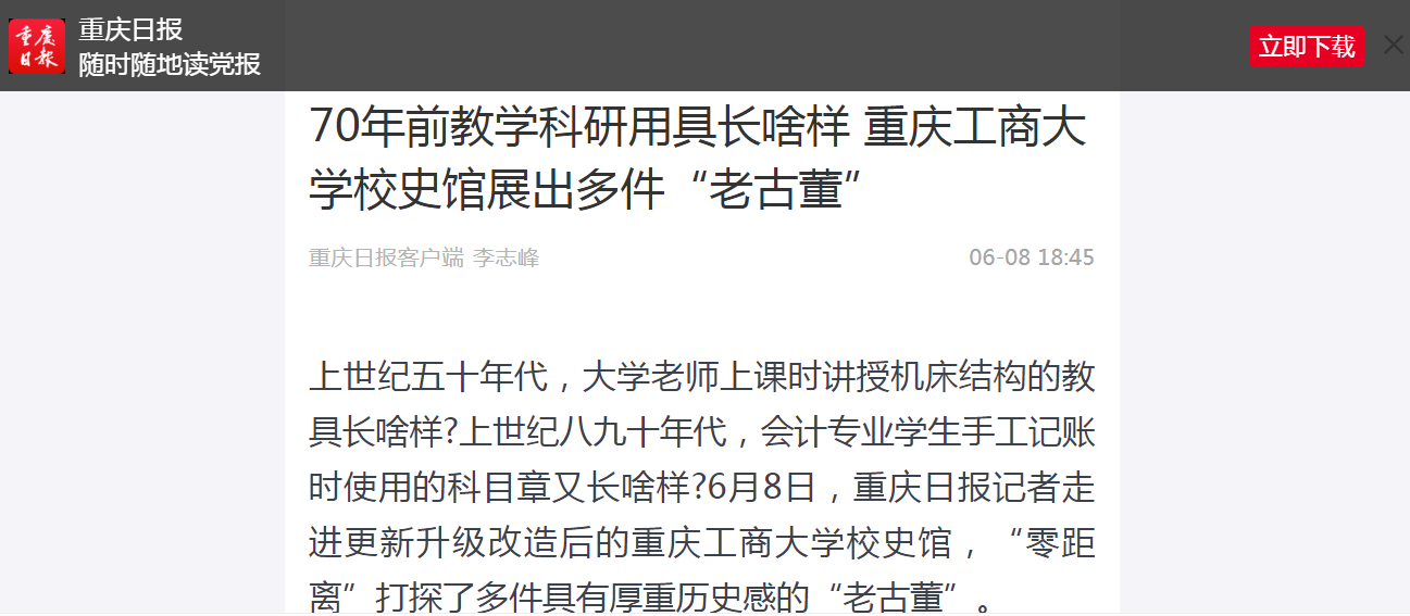 近日,重庆日报、华龙网等媒体报道我校庆祝建校70周年系列活动。6月7日,重庆日报微信公众号“渝小育”以“点赞 | 8xbet体育登录庆祝建校70周年,校史馆更新升级并发布校庆系列文化丛书”为题报道我校建校70周年升国旗仪式和校史馆更新升级开馆。6月7日,华龙网-新重庆客户端以“8xbet体育登录庆祝建校70周年升国旗仪式隆重举行”为题报道我校建校70周年升国旗仪式。6月8日,重庆日报客户端以“70年前教学科研用具长啥样 8xbet体育登录校史馆展出多件‘老古董’”为题报道我校校史馆更新升级。