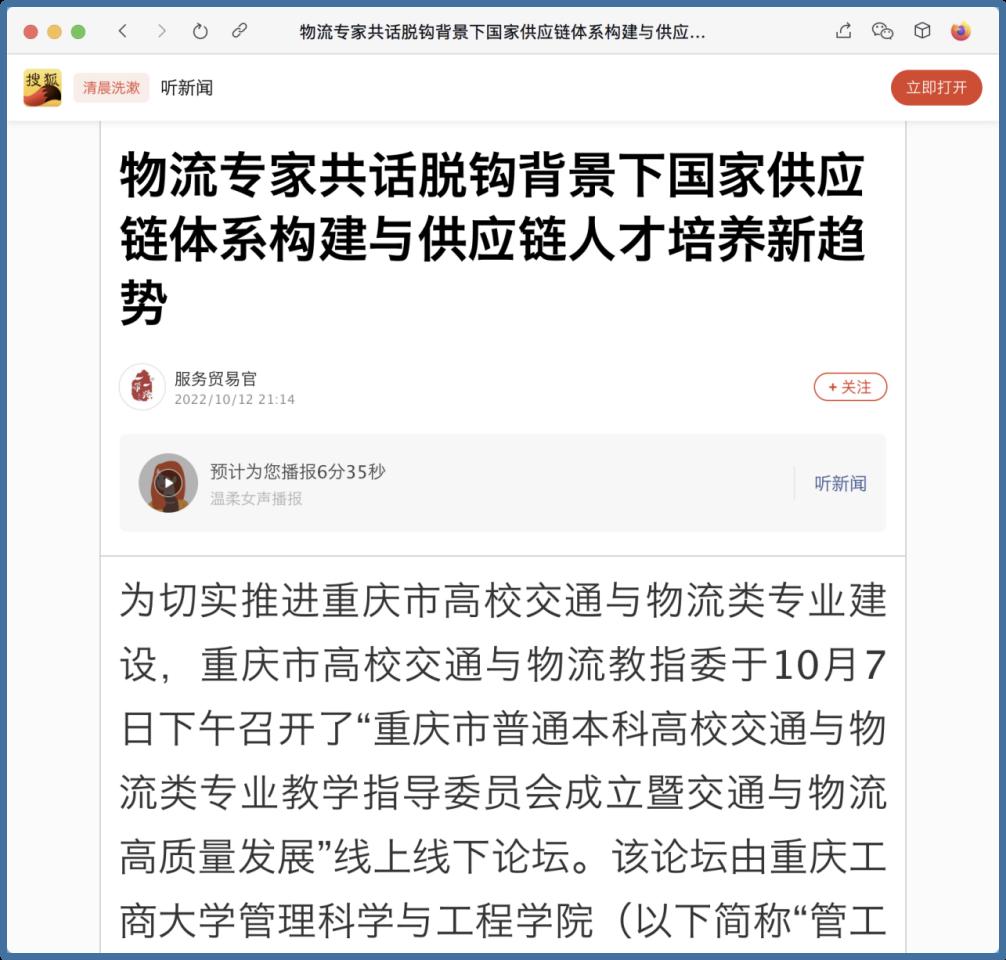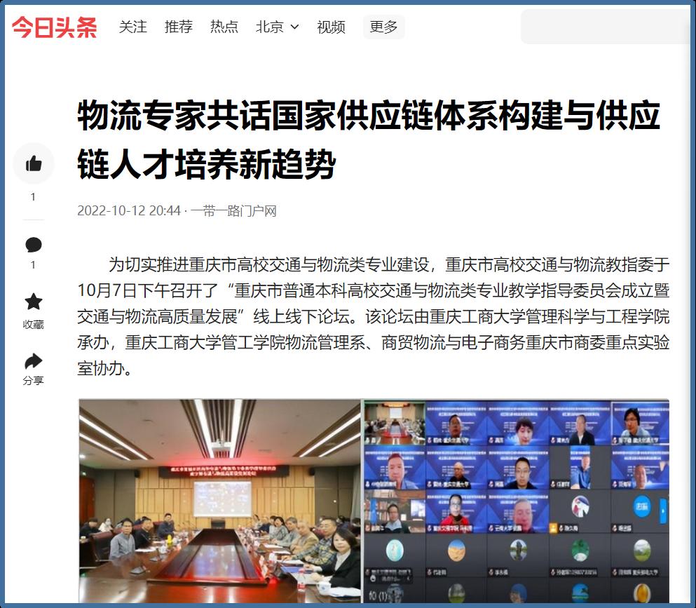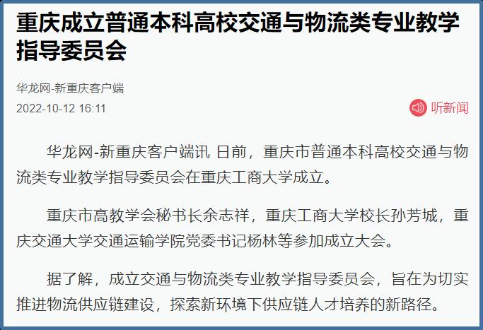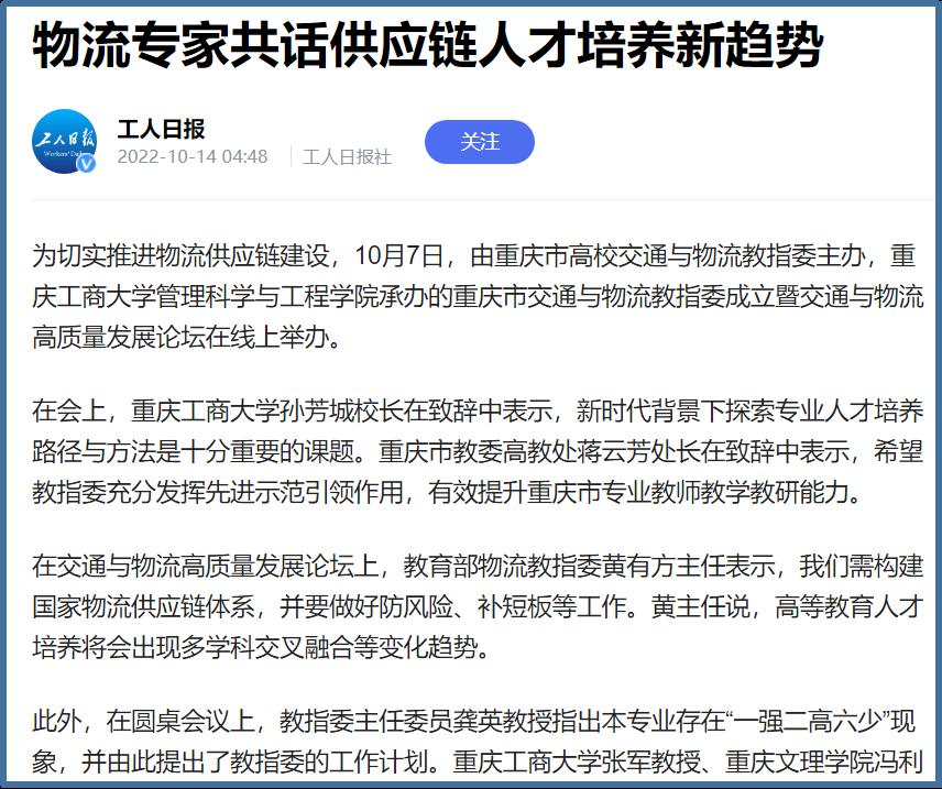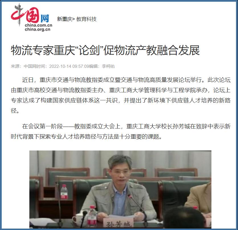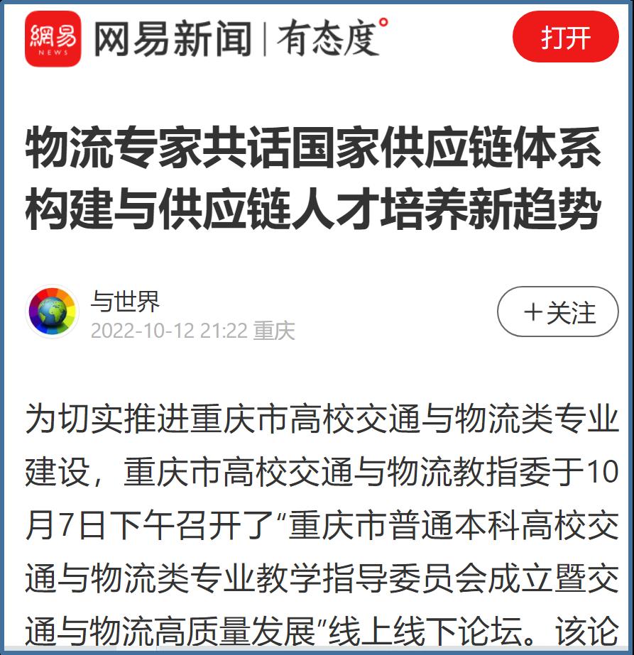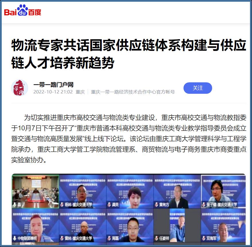 近日,中国网、工人日报、华龙网、今日头条、百度新闻、网易新闻、搜狐新闻等多家主流媒体聚焦交通与物流教指委成立、国家供应链体系构建、供应链人才培养新趋势等内容,对我校成功举办“重庆市交通与物流教指委成立暨交通与物流高质量发展论坛”进行广泛报道。成立大会上,8xbet体育登录校长孙芳城和市教委高教处处长蒋云芳致辞,高教学会秘书长余志祥宣读委员名单。论坛上教育部高校物流教指委主任黄有方、秘书长郭肇明、中国物流学会会长任豪祥、重庆市交通与物流教指委主任龚英、副主任雷林、副主任付启敏发表主旨演讲。圆桌会议上龚英、提出了工作计划,张军主任、冯利朋院长、陈坚副院长等就各自学校的一流专业经验进行了分享,其他委员为教指委的发展积极建言献策。会议由重庆市交通与物流教指委秘书长陈久梅和管理科学与工程学院院长黄钟仪副主任主持。来自教指委的委员以及全国各地物流本科院校的老师、行业协会等70余人参加本次论坛。