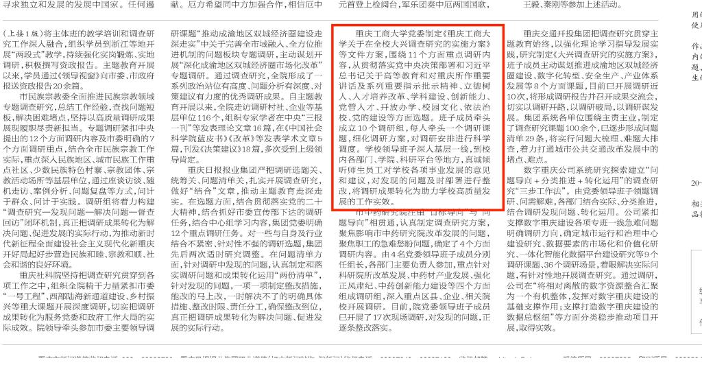 5月16日,重庆日报以《重庆第一批主题教育单位扎实开展调查研究》为题,报道我校扎实开展调查研究。报道中指出,学校党委制定《8xbet体育登录关于在全校大兴调查研究的实施方案》等文件方案,围绕11个方面重点调研内容,从贯彻落实党中央决策部署和习近平总书记关于高等教育和对重庆所作重要讲话及系列重要指示批示精神、立德树人、人才培养改革、学科建设、创新能力、党管人才、开放办学、校园文化、依法治校、党的建设等方面选题。班子成员牵头成立10个调研组,每人牵头一个调研课题,细化调研方案,对调研安排进行科学调度。学校领导班子深入基层一线,到校内各部门、学院、科研平台等地方,真诚倾听师生员工对学校各项事业发展的意见和建议,对发现的问题及时部署进行整改,将调研成果转化为助力学校高质量发展的工作实效。