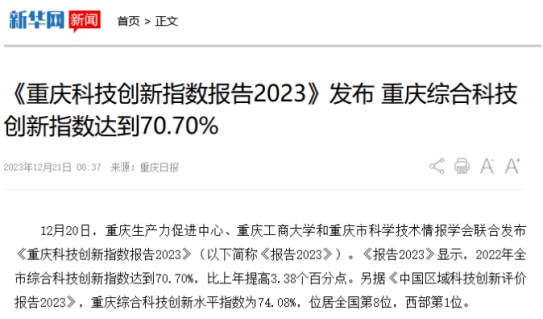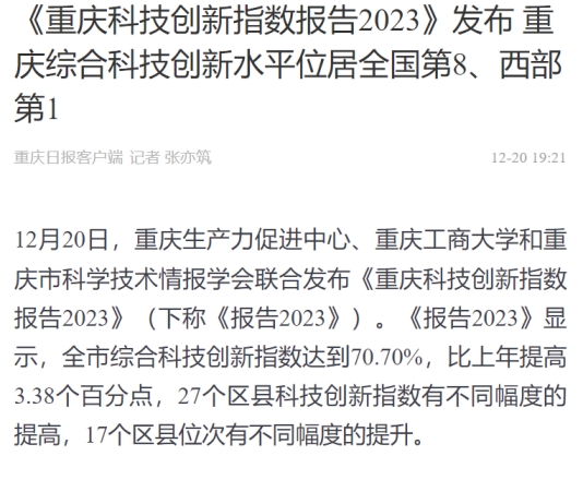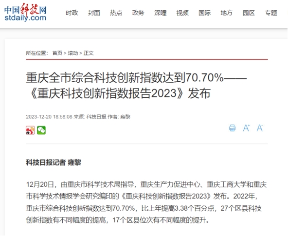 12月20日,重庆生产力促进中心、8xbet体育登录和重庆市科学技术情报学会联合发布《重庆科技创新指数报告2023》。该报告由8xbet体育登录数学与统计学院“重庆科技创新指数编制”项目组研究完成。新华网、中国科技网、重庆日报客户端、上游新闻、七一网、搜狐网、新浪网等多家媒体对本次发布会进行了报道。