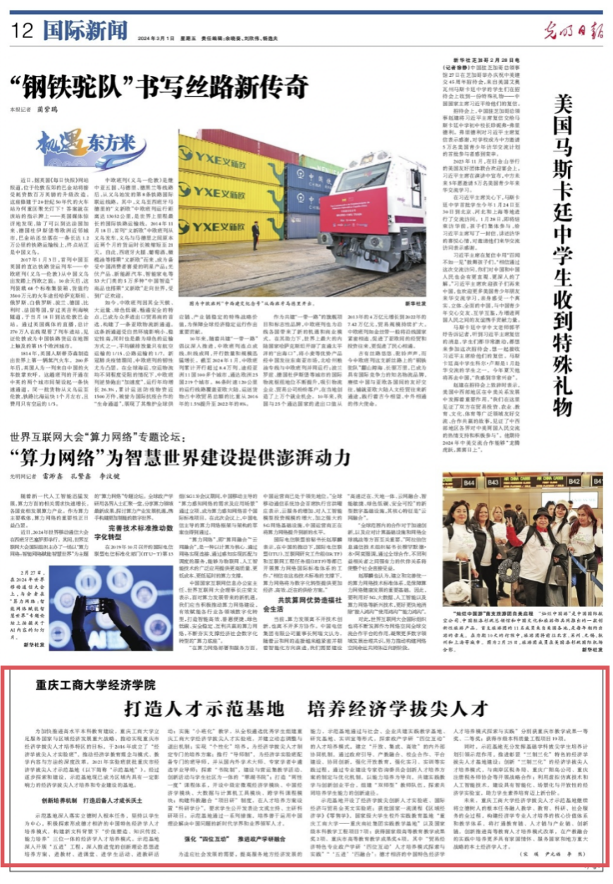 3月1日,《光明日报》第十二版以《8xbet体育登录经济学院:打造人才示范基地 培养经济学拔尖人才》为题,报道我校为加快推进高水平本科教育建设,立足服务国家与区域经济发展重大战略、推动实现重庆市经济学拔尖人才培养特区的目标,在探索和建设重庆市经济学拔尖人才示范基地方面取得的突出成果。