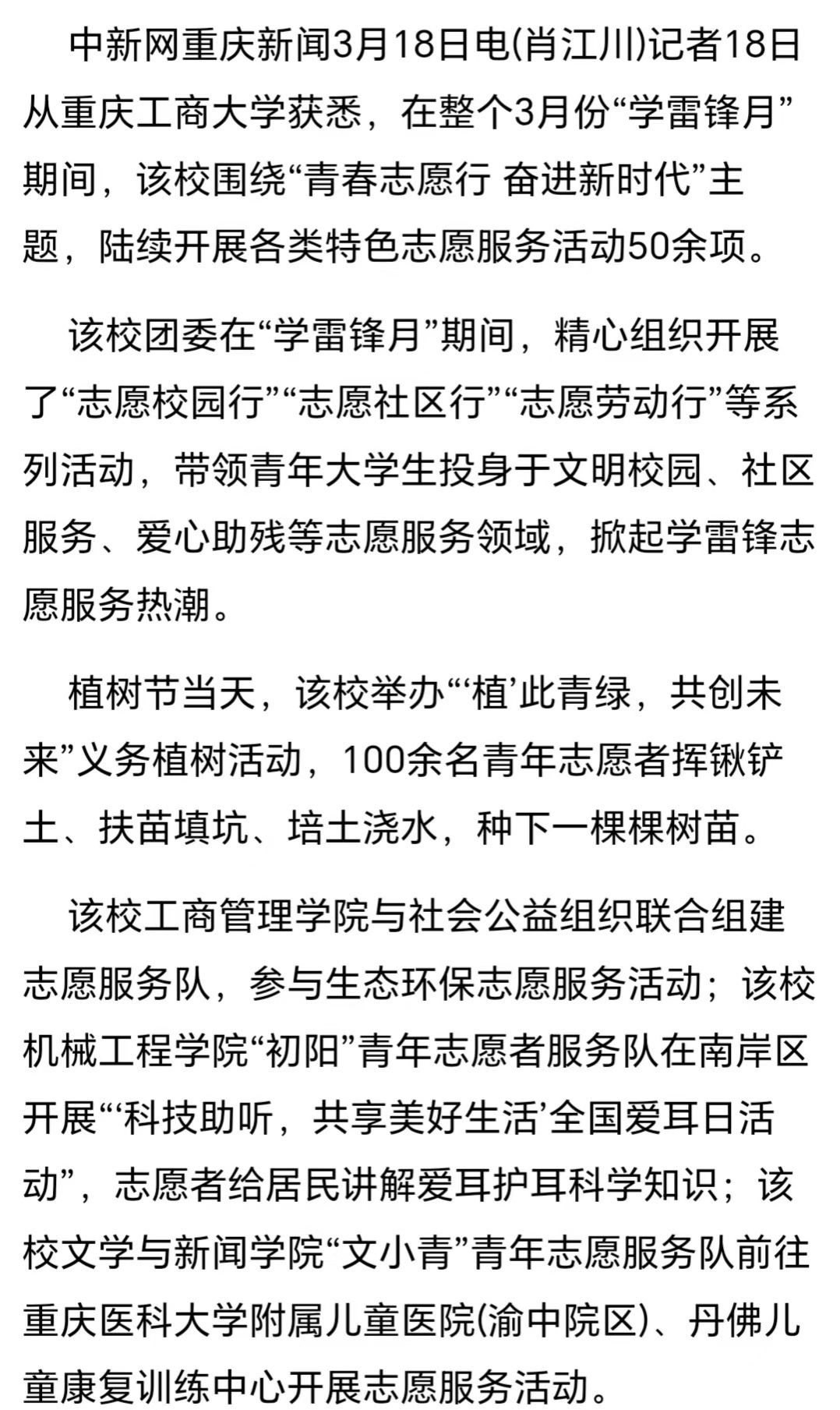 3月,我校“青春志愿行奋进新时代”雷锋月主题系列活动蓬勃开展,重工商大学子传递雷锋精神,投身于文明校园、社区服务、爱心助残等志愿服务领域,在青春的赛道上锤炼过硬本领,争做新时代追“锋”少年。
