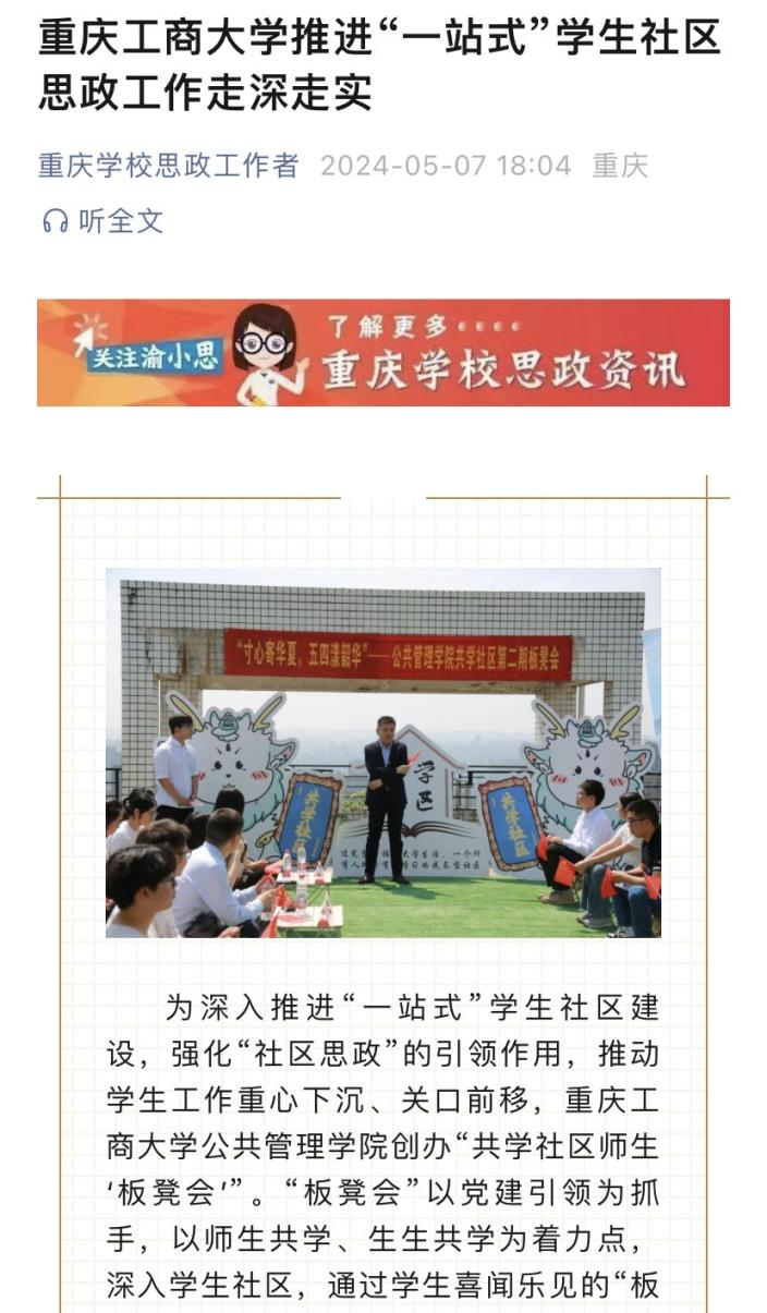 近日,重庆市教委“重庆学校思政工作者”微信公众号对我校公共管理学院“一站式”学生社区思政工作进行了详细报道。