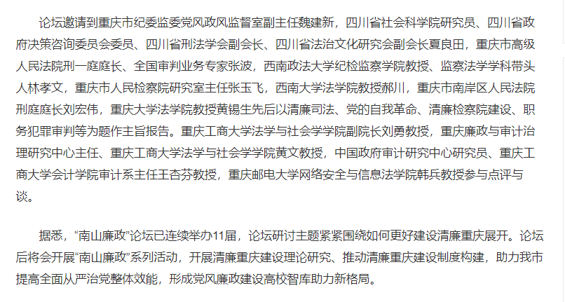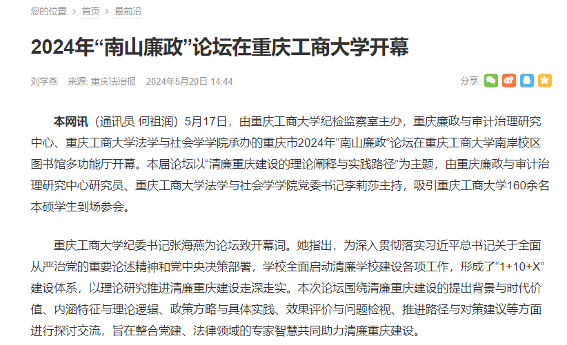 5月20日,《重庆法治报》报道我校举办2024年“南山廉政”论坛。
