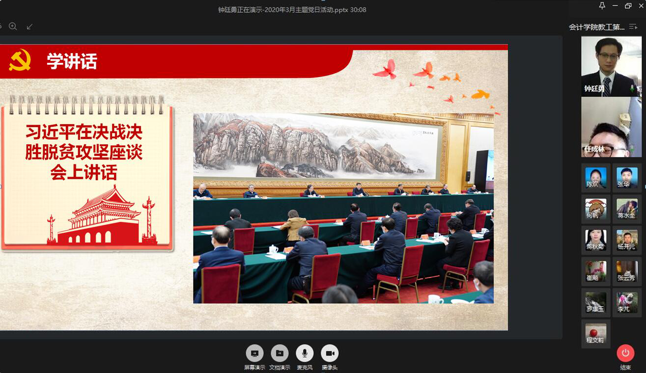 根据会计学院党委的安排部署,3月25日下午,学院教工二支部依托企业微信网络平台开展了“坚定制度自信,讲好中国故事”主题党日活动。学院党委书记罗惠玉、副院长程文莉以及教工二支部的党员教师首次通过企业微信会议形式参加了主题党日活动。主题党日活动由学院教工二支部支委任成林主持。整个活动以“学讲话、谈体会、促转化、育人才”为主线,党员同志们学习认真、发言热诚、获益良多,活动持续进行了近100分钟。