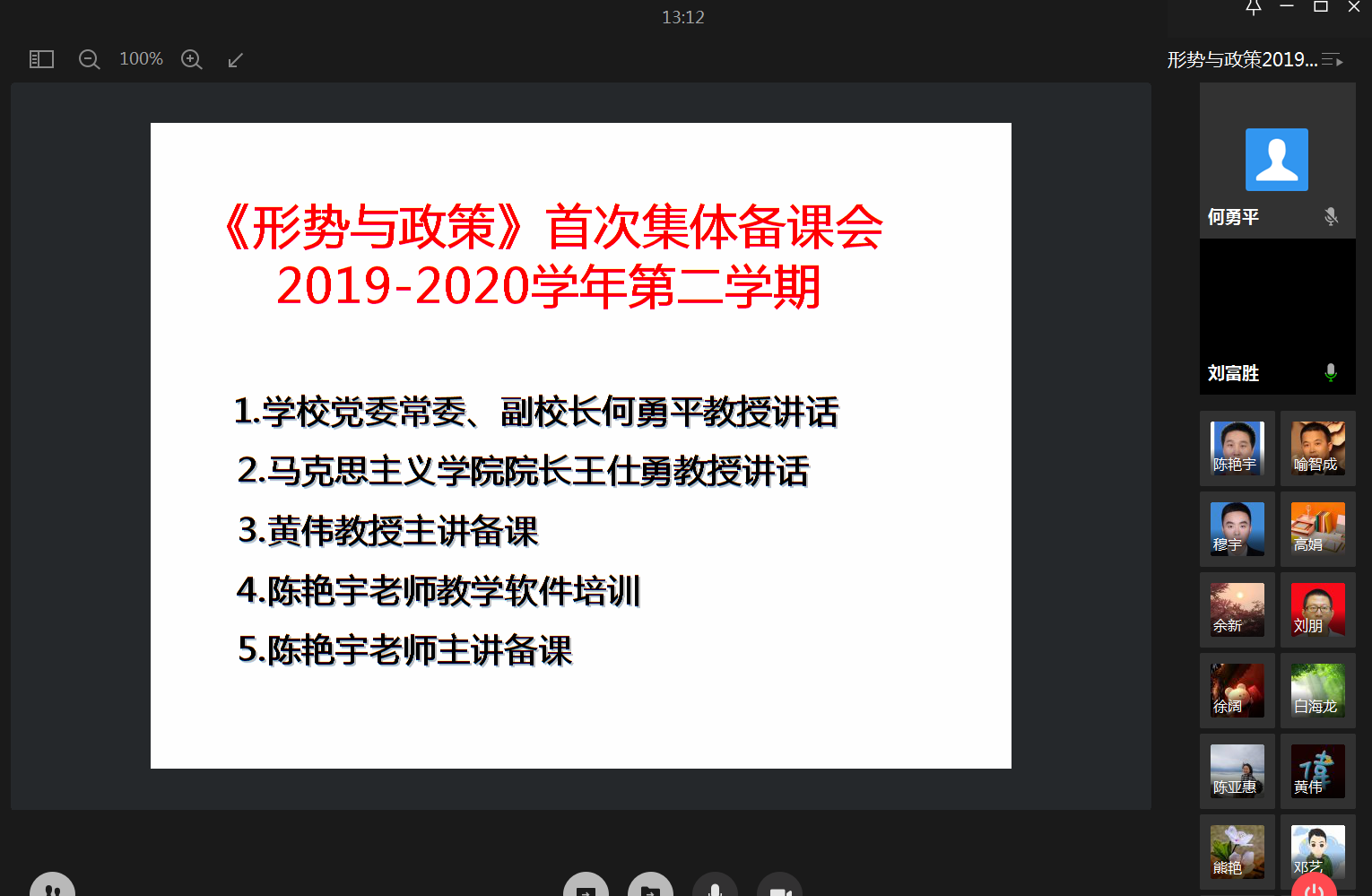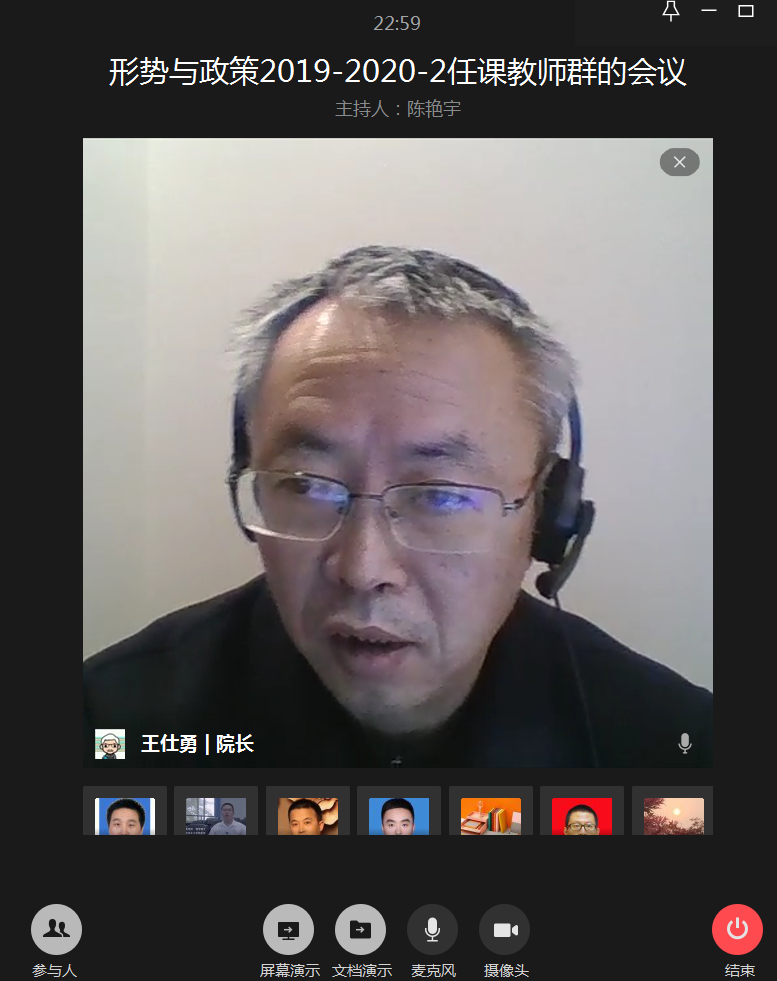 何勇平在讲话中指出,马克思主义学院对疫情期间的在线教学进行了充分准备,制定了适合思政课特点的教学方案,成立了在线教学技术培训小组,为课程顺利开设奠定了坚实基础。“形势与政策”课程一直坚持集体备课传统,通过专家备课、示范讲课和问题讨论,提升教学实效、增强学生获得感。本学期“形势与政策”课程具有三个特点:形式创新强、内容更新快、困难挑战多。开课前已经有了“校长第一课”,最近教育部又组织“全国共上一堂思政课”,“形势与政策”更要及时介绍党中央的最新精神和疫情防控的最新成就。何勇平对“形势与政策”课在线教学提出了三点要求:思想上高度重视,努力做到线上教学与线下教学“同质同效”;行动上落细落实,做好开课前各项准备,要进行设备调试,要组织学生进行在线试讲;效果上精益求精,不断总结经验提升教学技能,教研部和老师之间要相互帮助,形成教学合力。