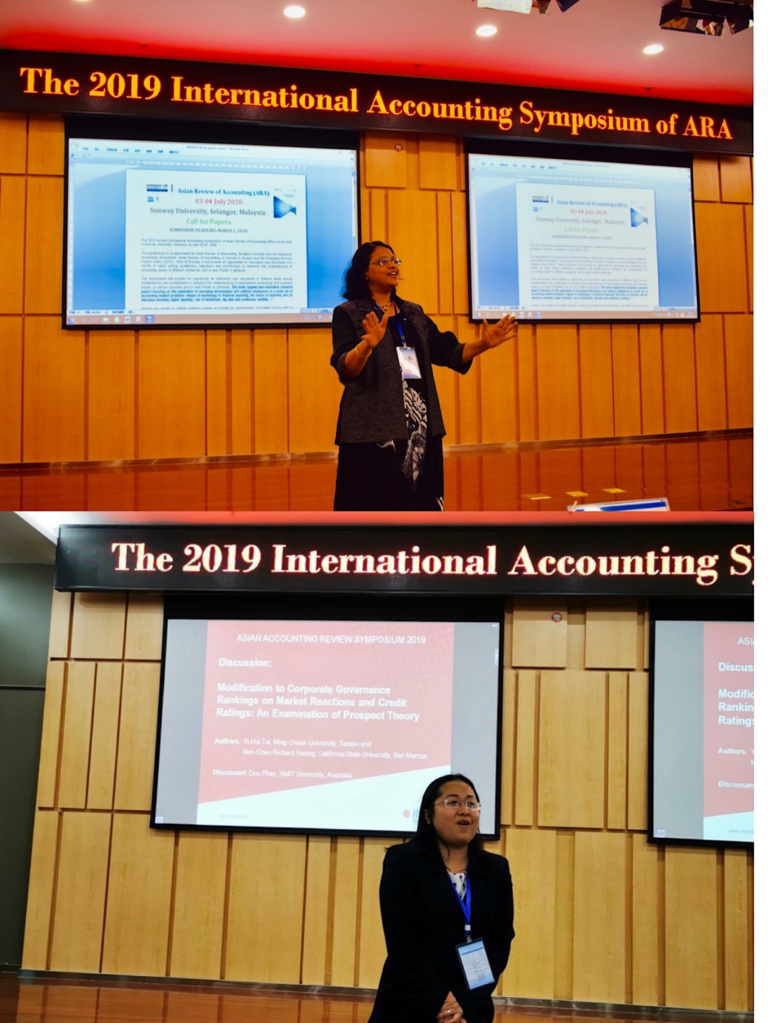 最后,下一届承办方澳大利亚皇家墨尔本大学的Duc Phan教授和马拉西亚双威大学、马拉西亚会计学会会长Susela Devi教授分别发言。他们首先对8xbet体育登录成功举办2019年亚洲会计评论学术年会表示祝贺,并对有机会承办2020年学术研讨会表示衷心的感谢。随后,Duc Phan教授和Susela Devi教授分别通过短视频方式对皇家墨尔本大学和双威大学进行了介绍,并诚挚邀请各位专家学者参加2020年的学术年会。