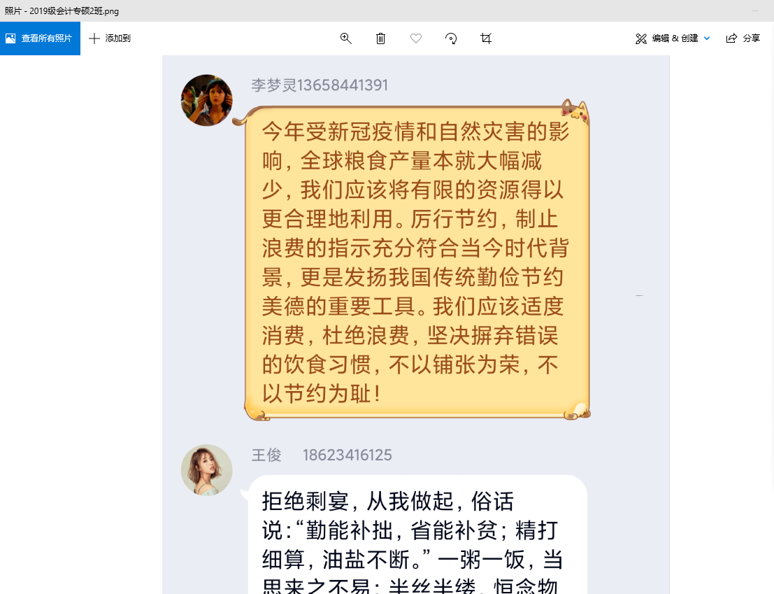 活动中,同学们围绕“拒绝舌尖上的浪费”的主题展开了积极的讨论。2017级丁俊程说到:“以“光盘”为荣,以“剩饭”为耻,坚持“餐餐不余、年年有余”,争做爱粮节粮的践行者。”2017级杜燕玲讲到:“节用裕民、俭以养德。我们要继续弘扬艰苦奋斗、勤俭节约的优良传统,自觉养成勤俭节约的习惯。”2018级林婉滨谈到自己的感想:“这一切时刻在提醒我们杜绝浪费,从我做起。餐餐光盘、科学点餐、拒绝铺张、健康饮食、记得打包、坚守‘粮’心。”每一段文字都体现会计学子作为新一代青年居安思危的意识,自觉做到反对餐饮浪费,践行勤俭节约的良好习惯。