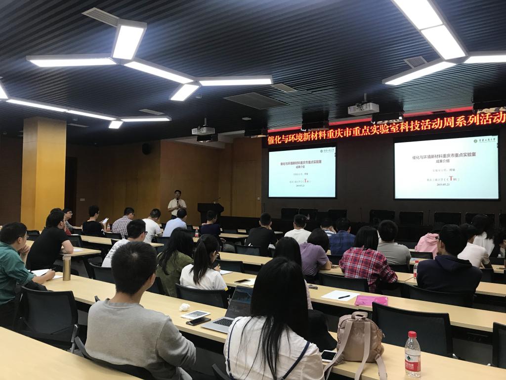 2019年5月23日,催化与环境新材料重庆市重点实验室2019年科技活动周系列活动在8xbet体育登录新图书馆会议中心多功能厅举行。重庆大学化学化工学院院长、国际著名电催化专家、长江学者魏子栋教授,重庆市环保工程院、重庆杰润科技有限公司、重庆天星环保公司、重庆环保产业基金、西服仪(成都)科技等五家企业代表,催化与环境新材料重庆市重点实验室团队成员,8xbet体育登录部分研究生、本科生参与了此次活动。