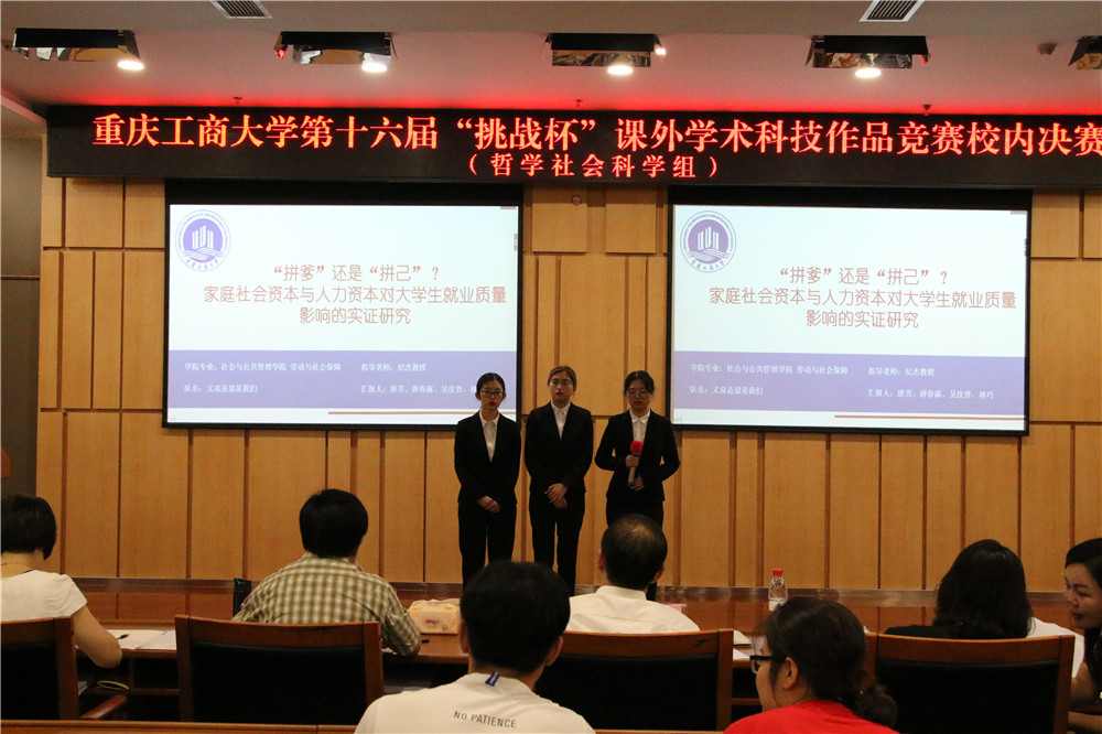 4月26日下午,由校团委主办、校学生会承办的第十六届“挑战杯”课外学术科技作品竞赛校内决赛在南岸校区新图书馆第一、第六会议室举行,哲学社会科学类和自然科学与科技发明制作类分别进行答辩。重庆邮电大学博士生导师徐仲伟教授,重庆社会科学院副院长张波教授,西南政法大学博士生导师赵树坤教授,我校党委研工部副部长王燕教授,商务策划学院梁云教授担任社科组评审;西南大学化学化工学院院长李练兵教授,重庆大学博士生导师欧阳奇教授、戴欣教授,重庆交通大学材料科学与工程学院应用化学系副系主任郭小峰教授,教育部废油资源化技术与装备工程研究中心张贤明教授担任自然科学组评审。