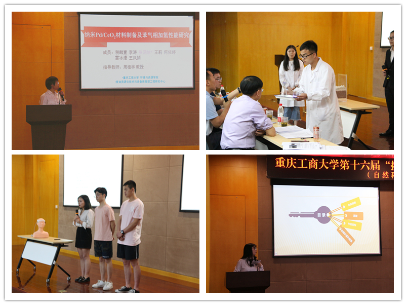 决赛分为作品展示和答辩两个环节。在展示环节,选手们通过PPT及实物演示,详细介绍了包括作品设计理念、制作原理、市场潜力、后期完善等方面在内的内容。参赛作品种类丰富、选题广泛,有自然科学与科技发明制作项目《有序介孔SiO2@Ni材料制备及甲烷二氧化碳低温重整制氢的研究》《一种基于类石墨型复合材料的处理染料废水的新型装置》《基于虹软算法的AI人脸识别门禁系统》;有哲学社会科学项目《“两不”视域下国家高新区创新能力提升之道——基于信息熵及改进EDA模型的多维测评》《“老漂族”城市适应困境与帮扶对策》《贫困地区农产品电商扶贫的农户收入效应研究——基于渝黔国家电商示范县的调研 》等等,评委们对项目的学术性、科学性、可行性、实用性、发展性进行了点评,并提出了评审意见和相关建议。